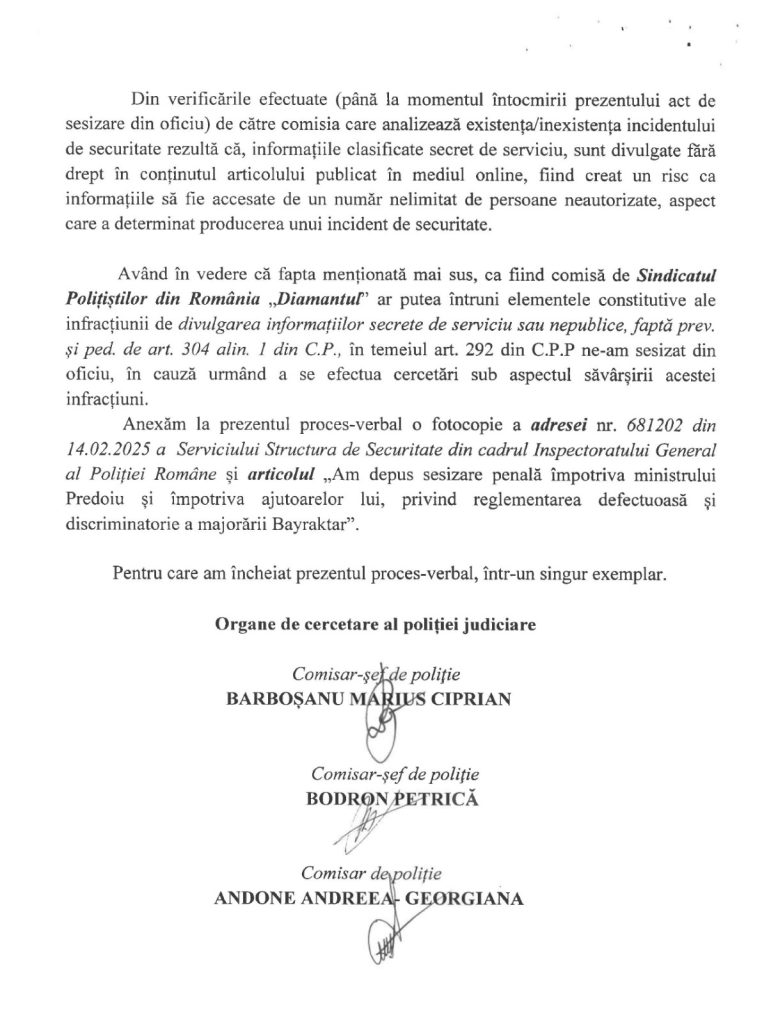 “Fapta” Sindicatului: La data de 13.02.2025, Sindicatul “Diamantul”, în exercitarea atribuțiilor sale legale de apărare a drepturilor polițiștilor, a publicat pe site-ul propriu (sprd.ro) un articol intitulat „Am depus sesizare penală împotriva ministrului Predoiu…” . Acest articol conținea textul unui Denunț Penal formulat si depus de sindicat, prin presedinte Vitalie Josanu, care critica modul considerat abuziv și discriminatoriu prin care conducerea M.A.I. a reglementat acordarea majorării salariale “Bayraktar” prin OMAI S/84/2024 și S/16/2025 .