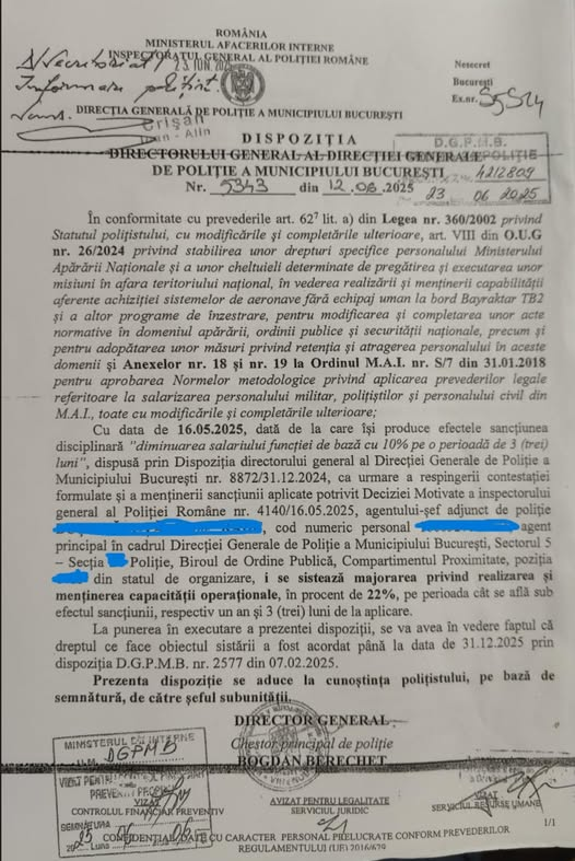 - Dispoziția D.G.P.M.B. nr. 5343/12.08.2025 : Document nesecret care acordă unui agent o majorare de 22% și citează direct Anexele 18 și 19.