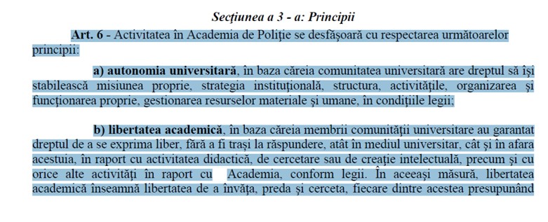 - CARTA UNIVERSITARĂ (Art. 6 lit. b): Garantează „libertatea academică” și „dreptul de a se exprima liber, fără a fi trași la răspundere, atât în mediul universitar, cât şi în afara acestuia”, precum și libertatea de a „împărtăși idei, în interiorul și în afara instituţiei”.