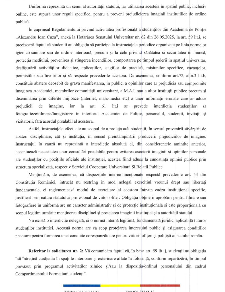 - REGULAMENTUL DE ORDINE INTERIOARĂ (Art. 75): Interzice strict exprimarea „în mediul online” (adică „în afara instituției”) fără aprobarea prealabilă a rectorului.