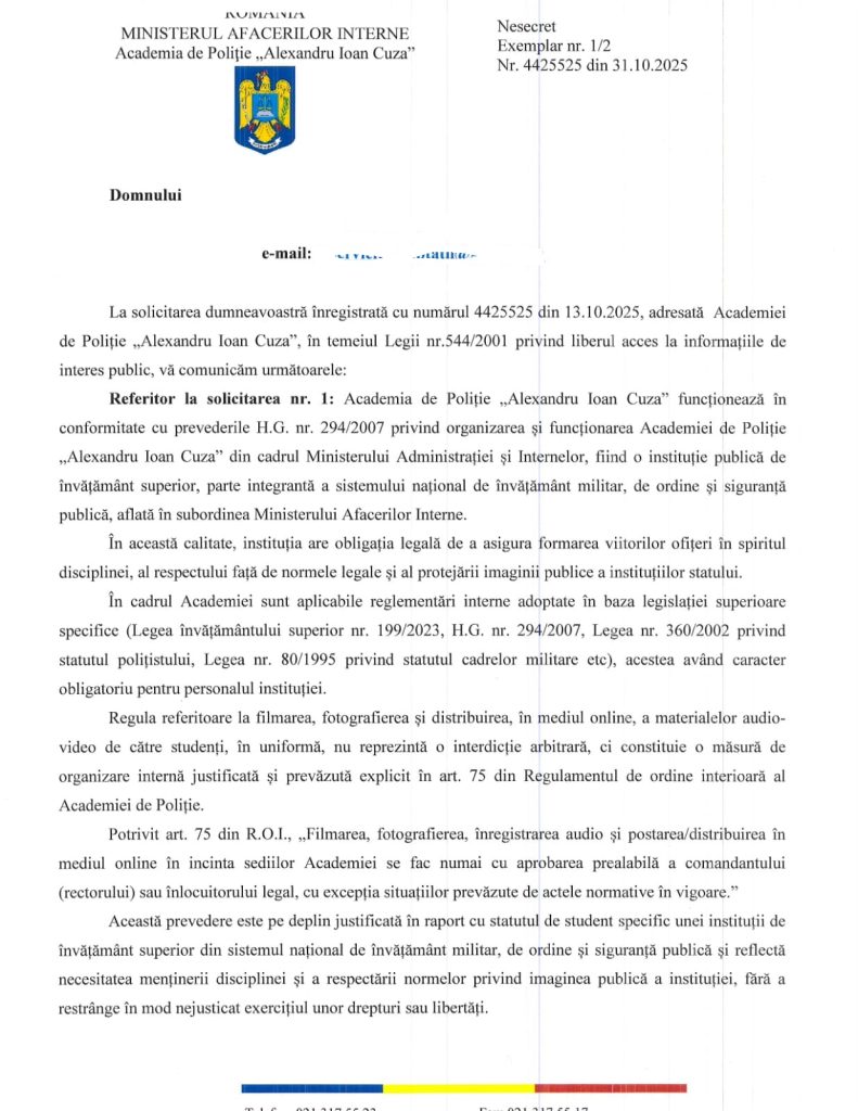 Purtăm de ceva vreme corespondență cu Academia și avem deja un material relativ bogat ce ne arată că această instituție pare să opereze după un set de reguli paralele, desprinse dintr-o epocă pe care România o credea apusă. Documente interne și semnalările primite scot la iveală o realitate îngrijorătoare: viitorii ofițeri, cei care mâine vor trebui să garanteze drepturile cetățenilor, sunt formați într-un sistem care pare să prețuiască supunerea oarbă mai mult decât legea însăși.