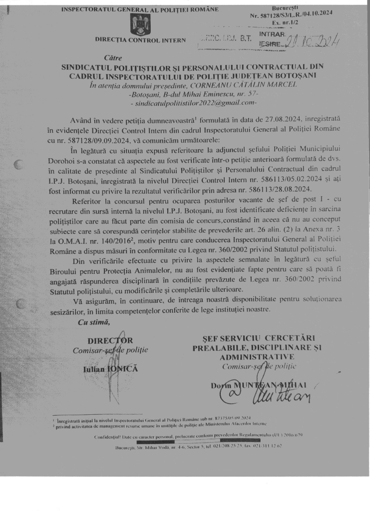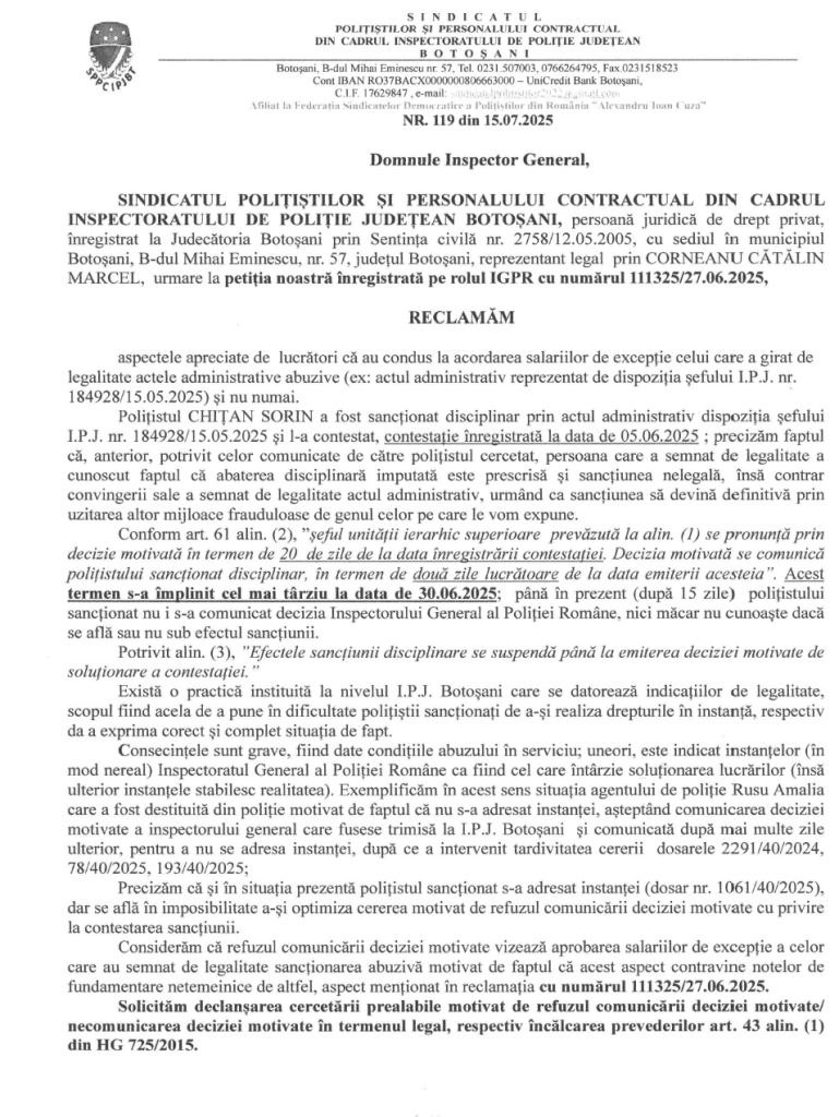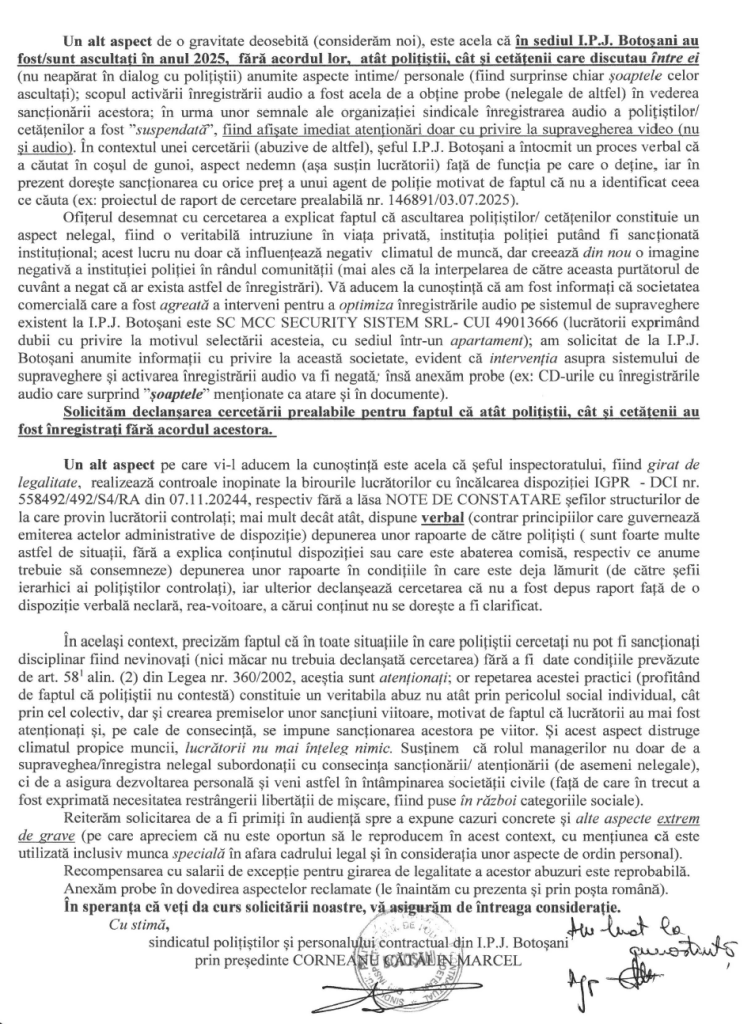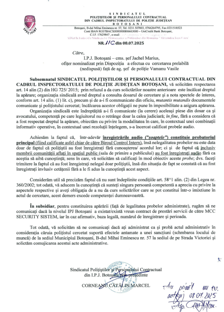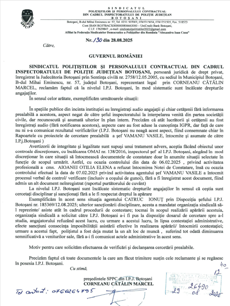 Sindicatul Polițiștilor și Personalului Contractual (SPPC) din IPJ Botoșani către Guvernul RomânieiSPPC Botoșani (președinte Corneanu Cătălin Marcel) formulează o sesizare către Guvernul României privind încălcarea sistematică a drepturilor angajaților la IPJ Botoșani, inclusiv aspectul înregistrărilor audio ilegale. Această sesizare vine ca urmare a răspunsului nesatisfăcător primit de la DCI pe 20.08.2025.