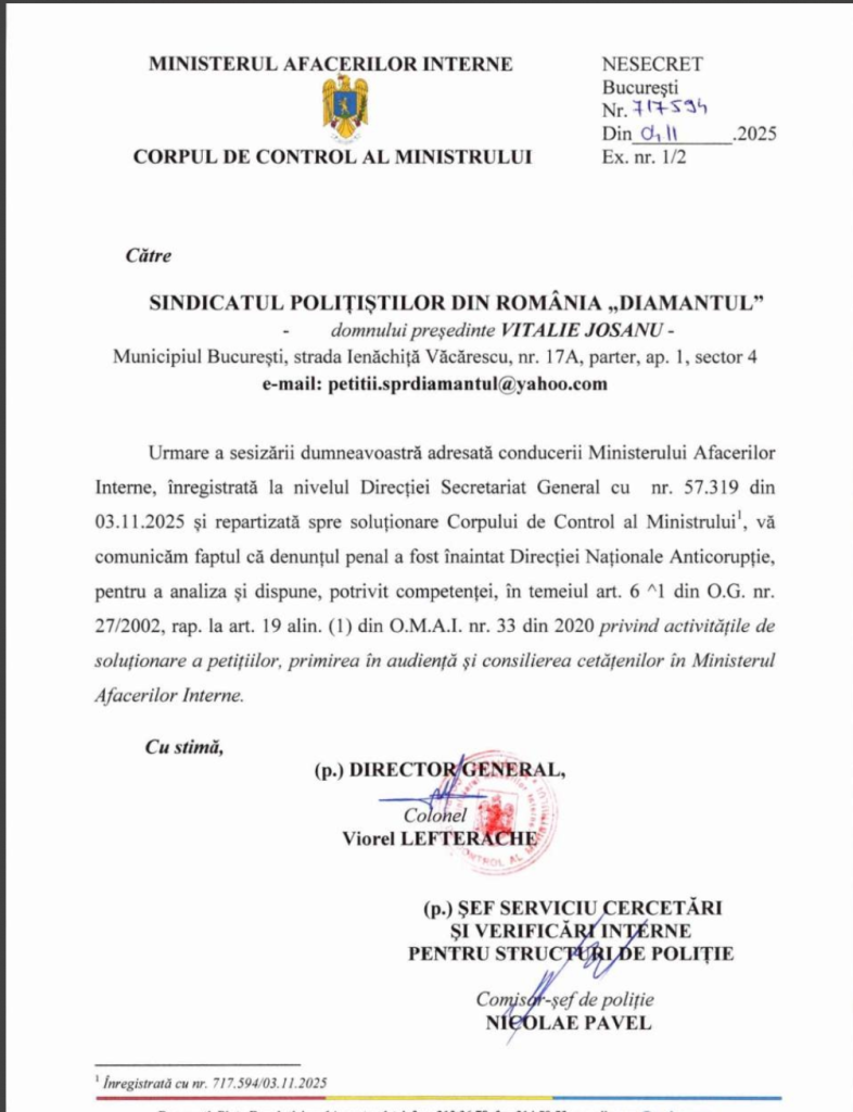 Ministerul Afacerilor Interne – Corpul de Control al MinistruluiCorpul de Control al Ministrului, prin Colonel Viorel Lefterache (Director General), confirmă primirea sesizării și informează sindicatul că denunțul penal a fost înaintat Direcției Naționale Anticorupție.