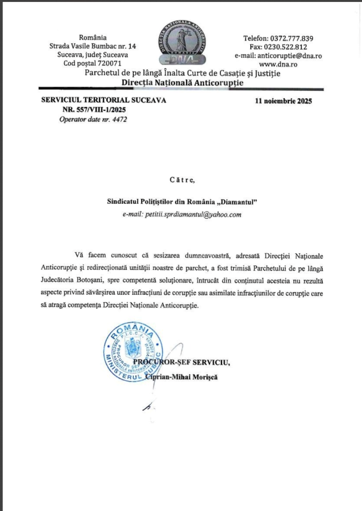 Direcția Națională Anticorupție (DNA) – Serviciul Teritorial SuceavaDNA Suceava înștiințează sindicatul că sesizarea lor, inițial adresată DNA central, a fost redirecționată și trimisă mai departe, spre competentă soluționare, către Parchetul de pe lângă Judecătoria Botoșani. Motivul este că, din conținutul sesizării, nu rezultă aspecte privind săvârșirea unor infracțiuni de corupție care să atragă competența DNA.