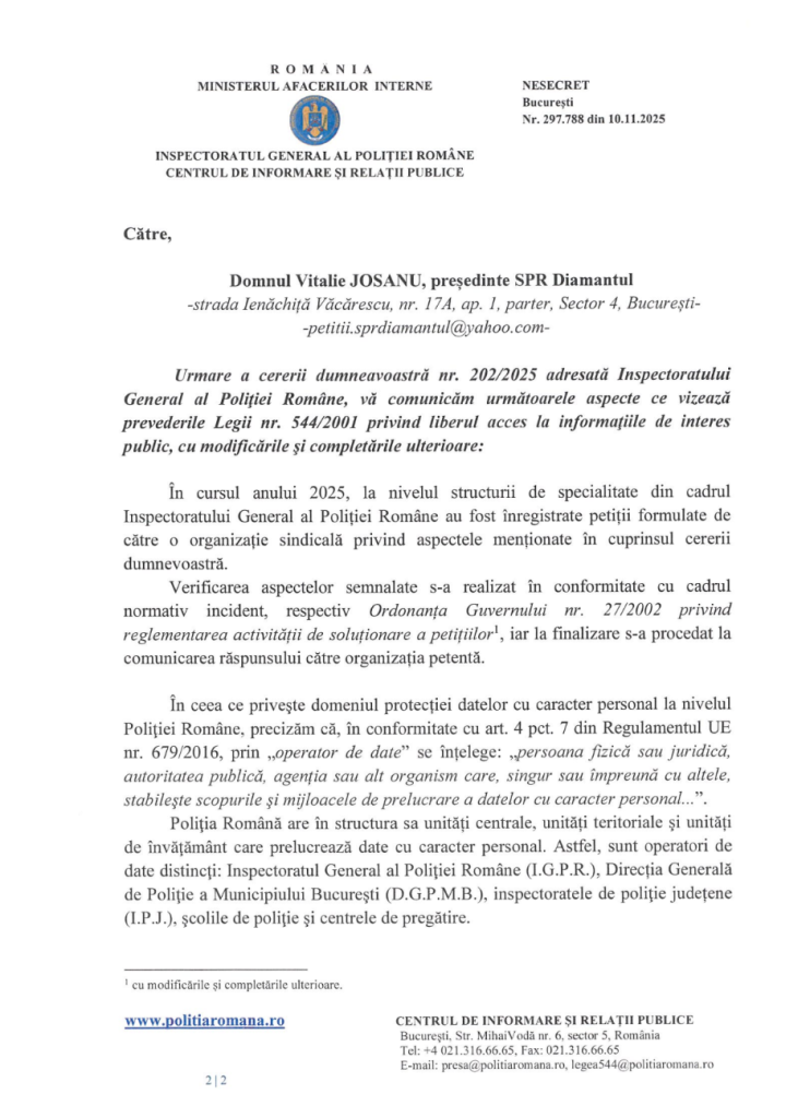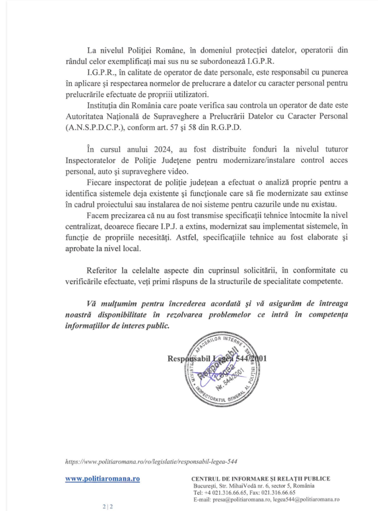 Inspectoratul General al Poliției Române (IGPR) – Centrul de Informare și Relații PubliceIGPR răspunde la cererea de informații publice nr. 202/2025 formulată de Sindicatul “Diamantul”. Răspunsul recunoaște implicit că Direcția Control Intern (condusă de Ionică Iulian) a fost sesizată anterior de Sindicatul PPC Botoșani (președinte Corneanu Cătălin) cu aspectul înregistrărilor ilegale, ceea ce confirmă inacțiunea și mușamalizarea problemei semnalate. IGPR menționează că în 2024 au fost distribuite fonduri pentru modernizare/instalare control acces personal, auto și supraveghere video la nivelul IPJ-urilor, iar specificațiile tehnice au fost elaborate și aprobate la nivel local, nu centralizat.