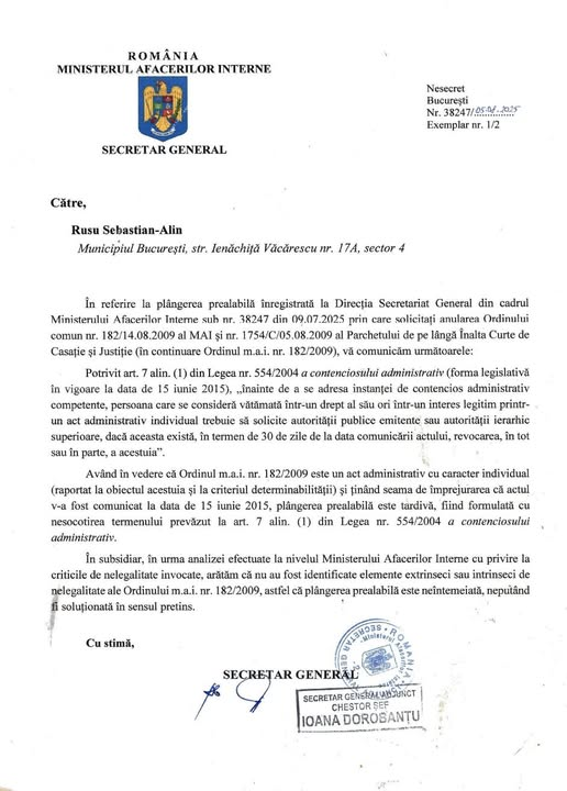 Mai jos aveti intampinarea ( care contine atasat si OMAI 182/2009) acestui mare expert al dreptului, depusa in dosar 280/39/2025 ( CA Suceava) unde incercam cu Alin Rusu sa obtinem anularea OMAI 182/2009 privind CFL. Asteptam pronuntarea, amanata pentru 20.11.2025.