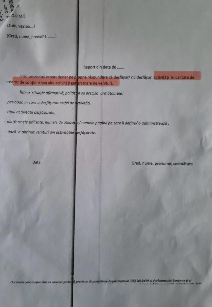 Potrivit anexei 10 din OMAI 140/2016, doar poliţistul care intenţionează să exercite ” funcţii sau activităţi în domeniul didactic, al cercetării ştiinţifice, al creaţiei literar-artistice, precum şi funcţii în alte domenii de activitate din sectorul privat, care nu sunt în legătură directă sau indirectă cu atribuţiile exercitate de poliţist, potrivit fişei postului” este obligat să informeze şeful unităţii, printr-un raport scris.