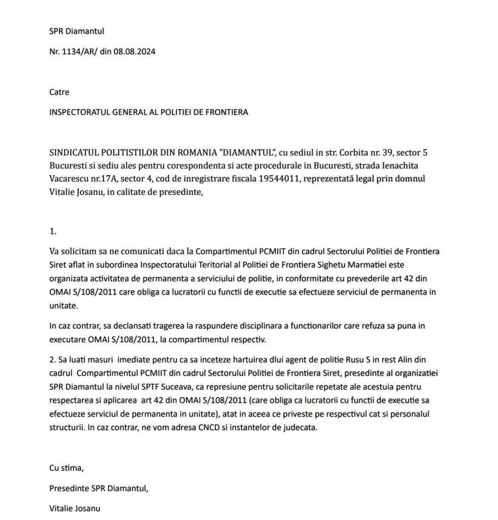 Acum ceva vreme, am trimis IGPF, adresa din foto, in care ceream respectarea regulilor efectuarii serviciului de permanenta astfel cum sunt enuntate de OMAI S/108/2011 si incetarea actelor de hartuire ale agentului Alin Rusu, lider sindical SPRD.