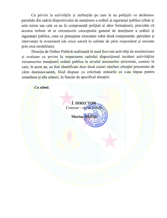 Prezentînd scuzele de rigoare vă prezint 2 siruații ce aș dorii să mă lămurească.Menționez că sunt pensionar MAI din 2019 și nu îmi este necunoscută uniforma și pregătirea/doctrina militară a poliției.Vă rog să mă lămuriți cu privința apariției pe mînecile uniformei de ordine publică(respctiv subofițeri ai secției 1 poliție)a ecusonului adeziv INSPECTORATUL GENERAL AL POLIȚIEI ROMÎNE,deoarece poliția de ordine publică nu are nimic de a face cu Direcția de Ordine Publică,care controlaeză/supervizează activitatea ordinii publice în întreaga țară.DGPMB este entitate sub contolul MI,și IGPR.Colegii,care au venit la o solicitare purtau acele ecusoane,nu aveau nici cea mai vagă cunoștință despre prevederile REGULAMENTULUU DIȘCIPLINEI MILITATE(am uitat,armata nu mai este obligatorie,iar ce îi învățați în școală e apă de ploaie),nu s-au prezentat,nu au purtat,măcar la subbrațul mîini stîngî cascheta.Îmi este rușine să mai spun că fac parte din corpul subofițerilor MAI.