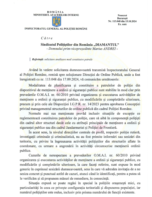 Pe fondul acestor frământări ale membrilor noştri, recent am solicitat lămuriri de la Direcţia de Ordine Publică atât cu privire la faptul că, în mai multe unităţi din subordinea I.G.P.R., pe fondul lipsei de personal şi a schemelor subdimensionate, DOSP sunt constitutite cu regularitate din lucrători ce nu au ca principale atribuţii ordinea şi siguranţa publică iar executarea ordinii şi siguranţei publice, în unele judeţe se realizează chiar şi în prezent la nivel de avarie, prin normalizarea situaţiilor excepţionale prevăzute de art. 10 ind. 1 (4) şi (5) din Ordinul M.A.I. nr. 60/2010 dar şi cu privire la faptul că, lucrătorii celorlalte structuri decât cele de ordine publică, pe lângă activităţile din DOSP asigură, în acelaşi timp, şi serviciul poliţienesc specializat structurii din care fac parte (poliţie rutieră, proximitate, investigaţii criminale, criminalistică etc), prin abandonarea temporară atribuţiilor dispozitivului de ordine şi siguranţă publică.