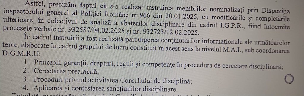 | IGI | “În perioada 2020-2025, tematicile privind procedura disciplinară au fost incluse anual în planurile de pregătire profesională ale unității” | 🔴 CONTRADICTORIU |