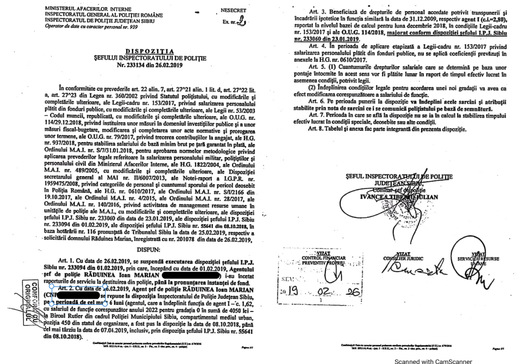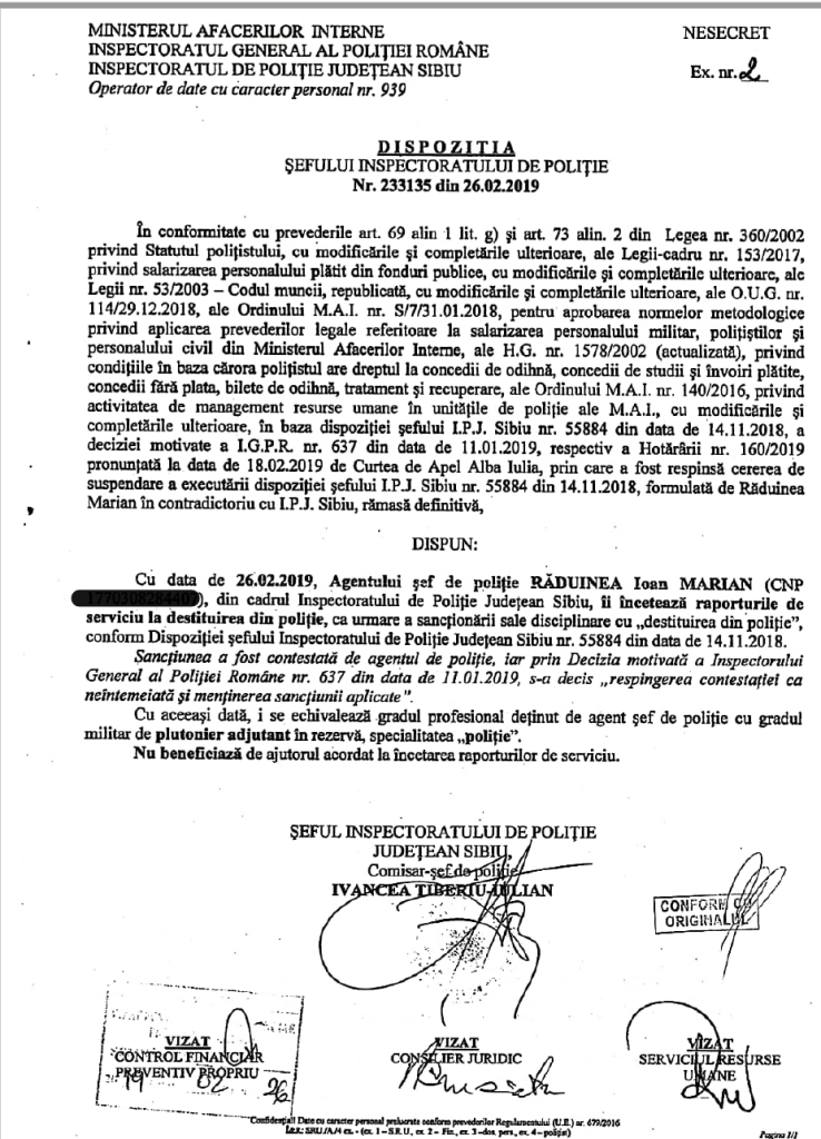 Metoda destituirilor multiple si rapide (vreo 6, daca tin minte bine) – fara a se tine cont de momentul determinat al incetarii indiscutabile a raportului de serviciu ca efect al primei destituiri producatoare de efecte prin respingerea contestatiei, in raport de care restul procedurilor disciplinare in derulare se impuneau a fi clasate pentru ca devenisera automat lipsite de obiect – in scopul diabolic de a nauci pe victima, pe avocati cat si pe judecatori, a fost inventata in 2019, la IPJ Sibiu, impotriva agentului de politie Marian Raduinea. Mai jos aveti dovada! Se observa ca pe 26.02.2019, exista o aparenta reincadrare, in scopul inselator de a se pretinde ca s-ar fi respectat o hotarare executorie de instanta, dupa care, in aceeasi zi, Raduinea e dat din nou afara. Ce nu stiau functionarii de la IPJ Sibiu implicati in actele de represiune impotriva lui Raduinea, este ca actele administrative produc potrivit legii, efecte pe zile, nu pe ore. (Prin comparatie, Ordonanța de reținere produce efecte din momentul specificat în ordonanță ca fiind începutul reținerii, adică ziua și ora la care măsura începe). Sa faci o reincadrare si o incetare prin acte administrative emise si cu efect in aceeasi zi, privind pe acelasi salariat, furnizeaza o dovada importanta ca acolo s-a savarsit infractiunea de nerespectare a unei hotarari judecatoresti (art 287 Cod Penal)