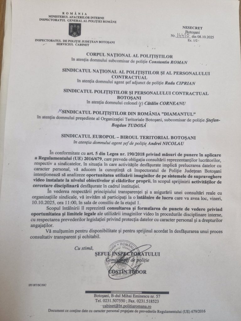 Intenția Inspectoratului de Poliție Județean (IPJ) Botoșani de a implementa un sistem de supraveghere video a propriilor angajați transcende granițele unei simple decizii administrative. Ea deschide o cutie a Pandorei juridică, plasând sub un reflector necruțător echilibrul fragil dintre nevoia de securitate a unei instituții și dreptul fundamental la viață privată al fiecărui om, chiar și atunci când poartă uniformă. Într-o societate democratică, o astfel de măsură nu poate fi un act discreționar, ci trebuie să treacă testul riguros al unui cadru legal complex, construit tocmai pentru a proteja individul de potențiale abuzuri.