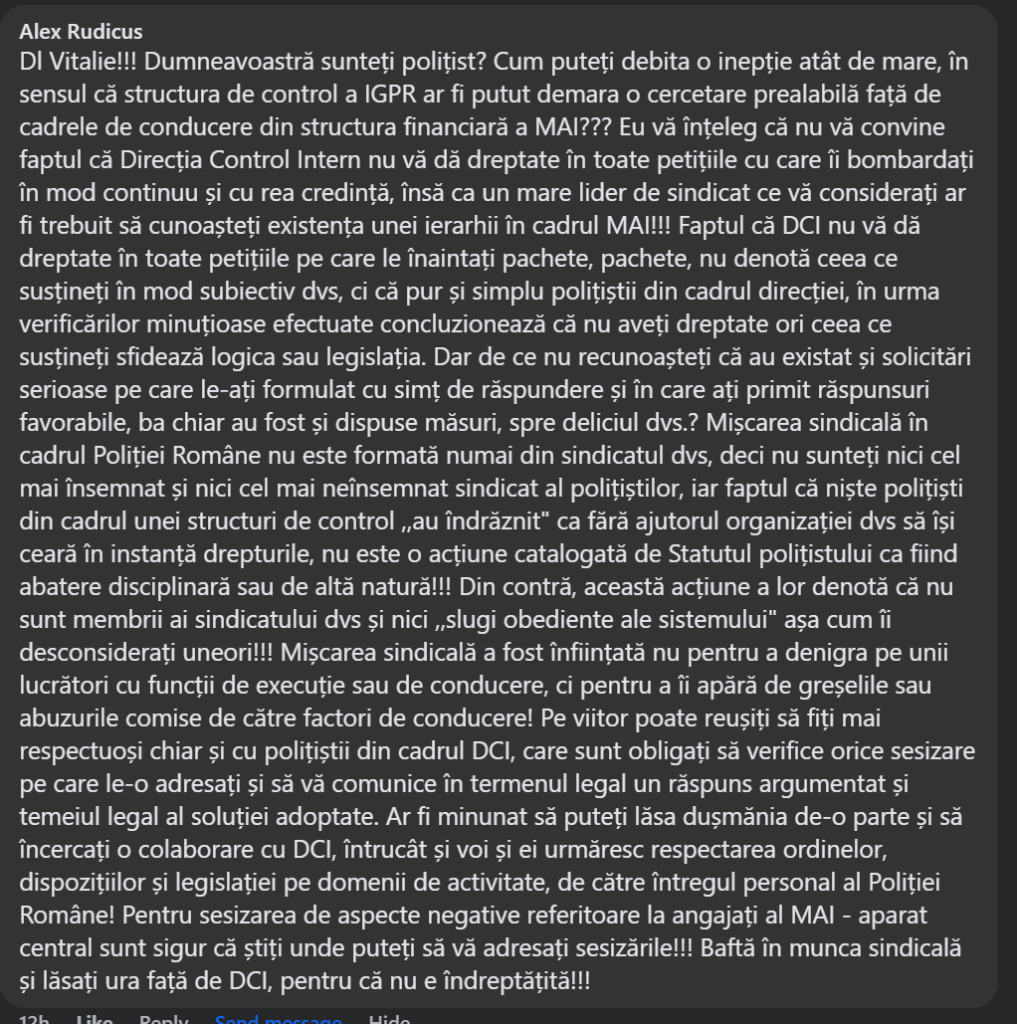 Nu are deosebita importanță pentru voi, cititorii, identitatea exacta a comentatorului , dar cred ca este relativ usor de ghicit că “Alex”este un lup tanar al Direcției control intern, cunoscător al detaliilor cercetării disciplinare desfasurate de DCI împotriva lui Vitalie si deci implicat in actele cercetarii. In acelasi timp, “Alex” pare ca este un reclamant impotriva IGPR, pentru recalcularea excelentei, intr-unul din dosarele pe rolul TMB, identificate si publicate de Vitalie in articolul lui. In dosarul cercetarii de la IGPR a existat un singur Alexandru, din cate imi amintesc eu.